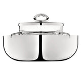 The two-piece silver plated caviar serving set in the Vertigo pattern contains an outer presentation dish for ice and a lidded bowl that can hold 4.4 oz. of caviar. Vertigo’s bold motif — a subtly asymmetrical, thick ring often placed playfully askew — can be found on every piece in the collection designed by Andrée Putman.