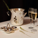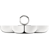 The Vertigo silver-plated serving dish features 3 medium sized bowls connected by a circular handle. This dish is perfect for serving nuts, olives and other light snacks. Vertigo's bold motif of a subtly asymmetrical, thick ring positioned playfully can be found on every piece in the collection designed by Andrée Putman.
